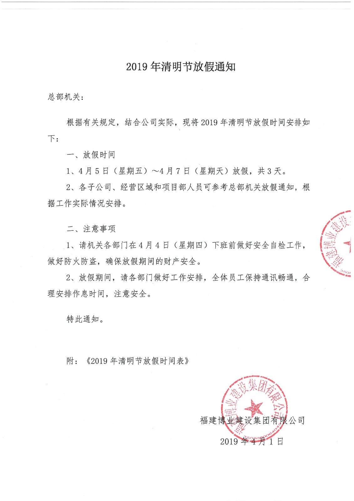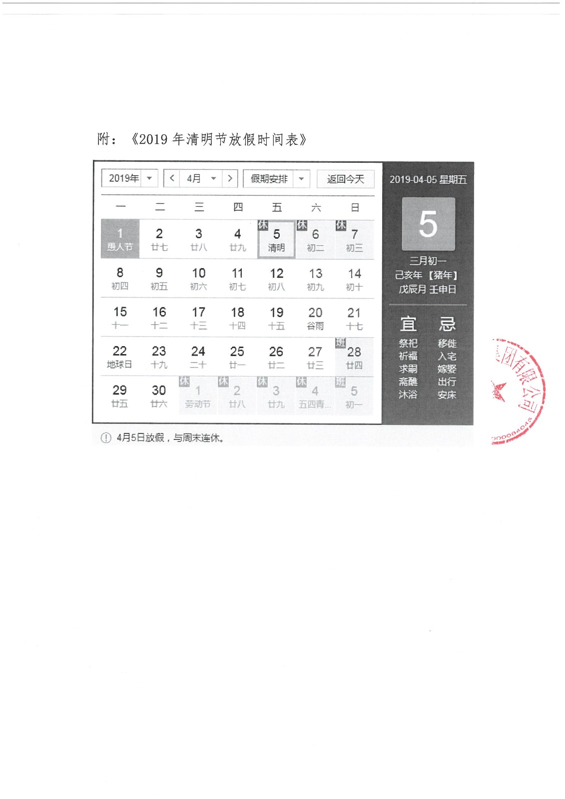 2019年清明节放假通知